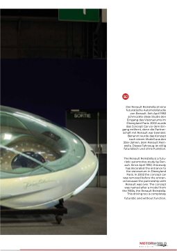 has decorated the entrance to the visionarium in Disneyland Paris. In 2002 the concept car was removed before the entran- ce because the partnership with Renault was over. The concept was named after a model from the 1930s, the Renault Reinstella. This driving too is completely